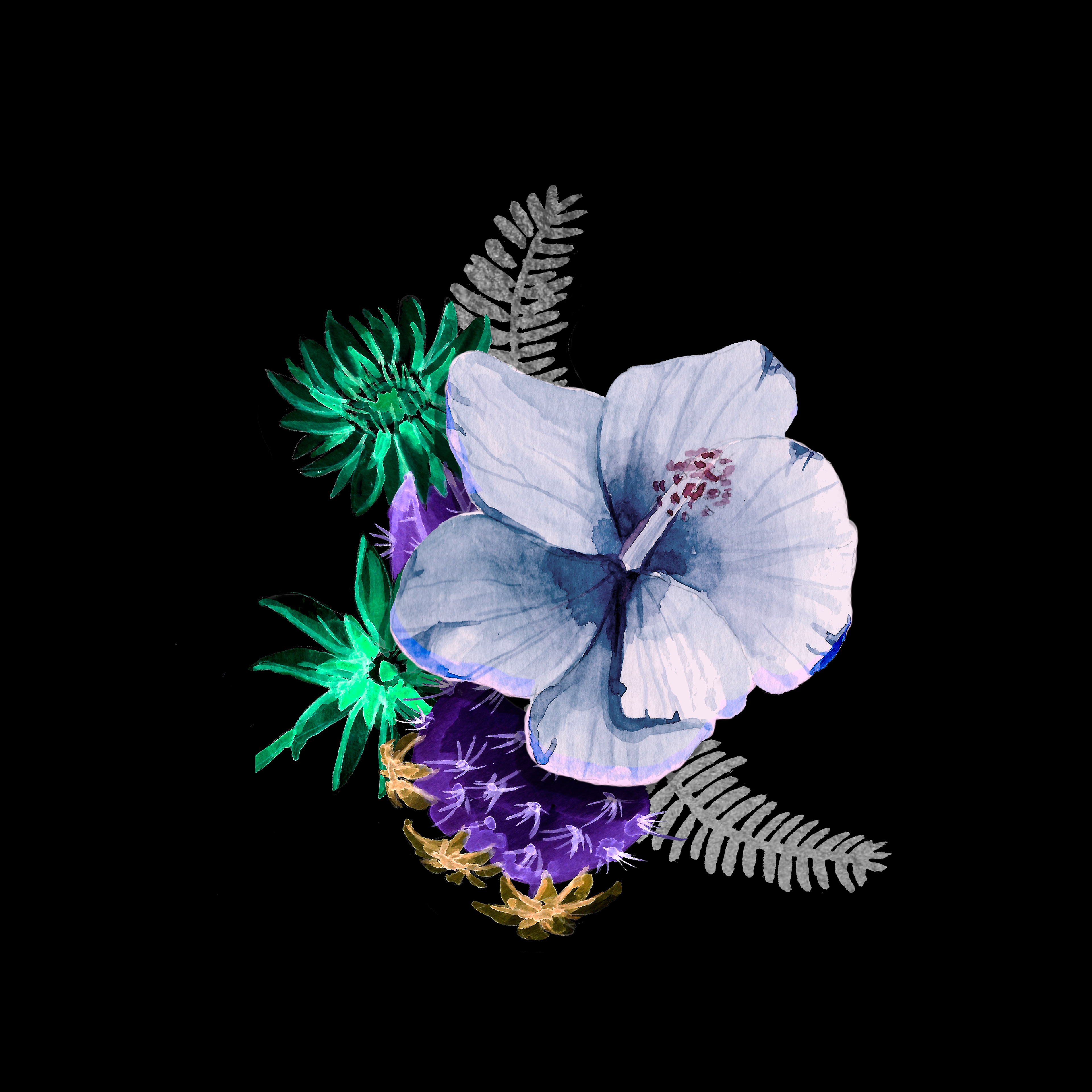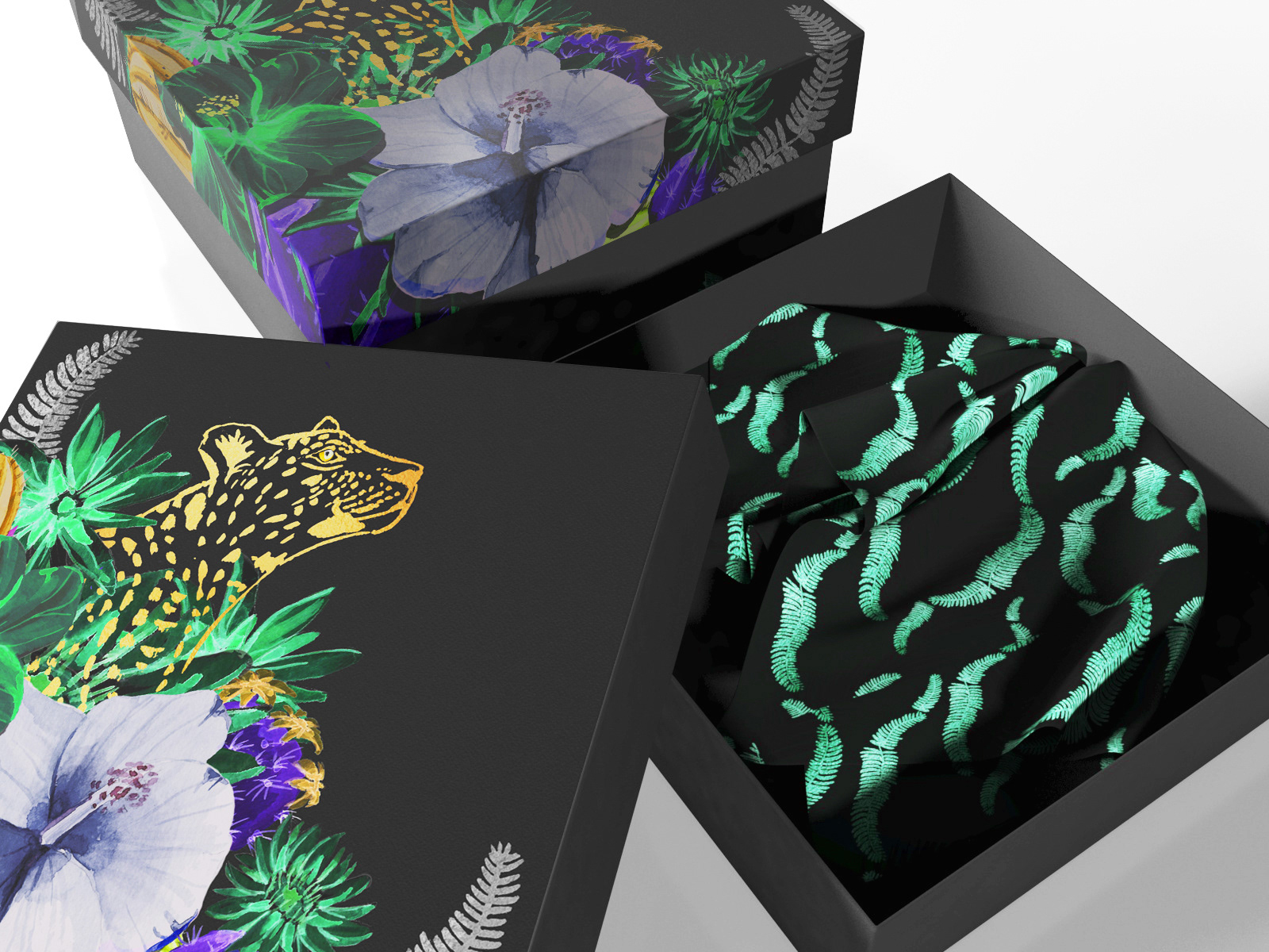 Watercolor design made for clothes and accesories company. Set includes box cover design, packing paper, thank-you notes, and other small pieces to use as company visual identity.